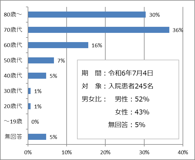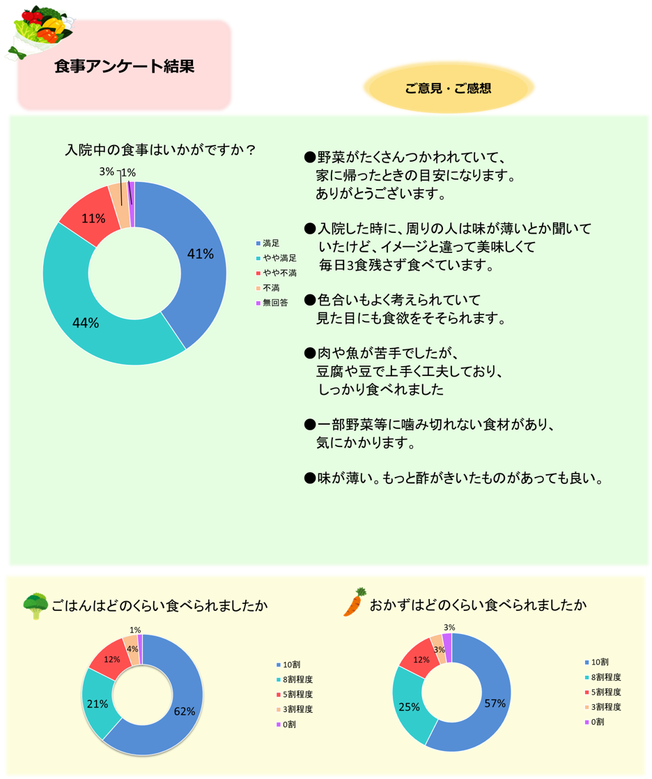 入院患者さまを対象に 朝食に関する食事アンケートを実施しましたので 結果をご報告いたします。 ご協力いただきありがとうございました。 |