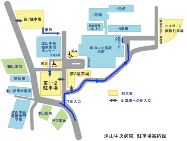 津山中央病院本館奥に救命センター(救急外来)入り口がございます。
