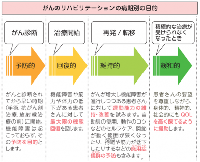 がんの療養におけるリハビリテーションは、医師による治療と並行して行われるため、病状の変化をはじめ、あらゆる状況に対応しながら、治療のどの段階においても、それぞれの時期にリハビリテーションの役割があります。(図1)
