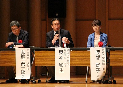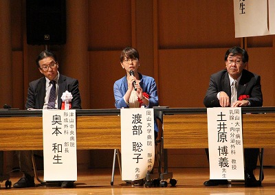 市民公開講座とは … 専門家による基調講演と、事前に頂いた参加者からの質問に医師や看護師等が解説付きでお答えするパネルディスカッションを行う聴衆参加型の公開講座