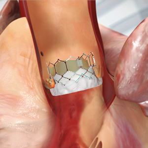 重症の大動脈弁狭窄症に対する治療法で、開胸することなく、また心臓も止めることなく、カテーテルを使って人工弁を患者さんの心臓に留置します。