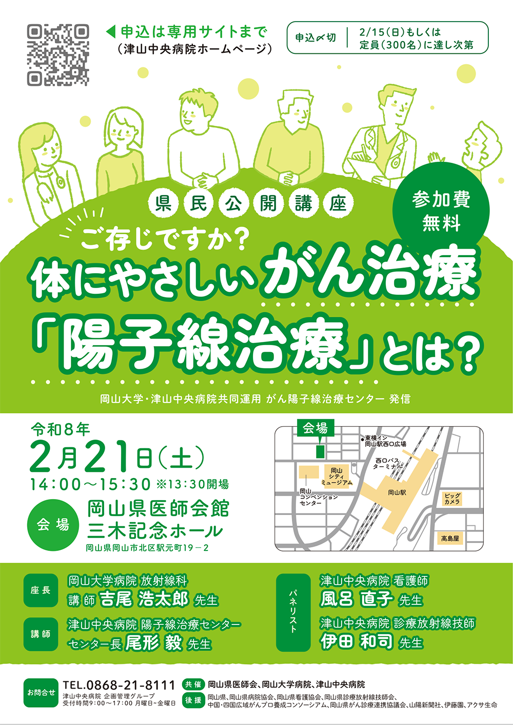 本講座では、岡山大学病院と津山中央病院が共同運用する「がん陽子線治療センター」の専門家たちが、従来の放射線治療よりも副作用を抑え、体に負担の少ない最新の「陽子線治療」について分かりやすく解説いたします。「陽子線治療って何?」「自分や家族に適用できるの?」といった疑問をお持ちの方、どなたでもお気軽にご参加ください。